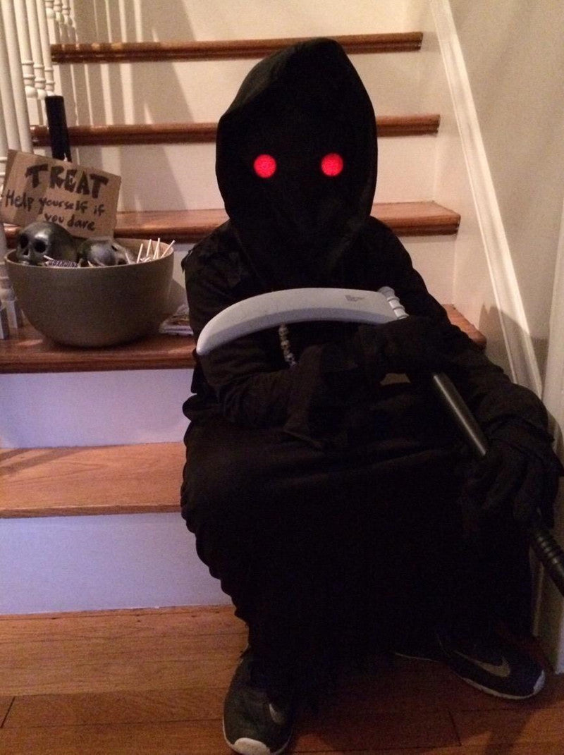 Halloween Kinderkostüm – Dunkler Geist mit roten Augen & Sense